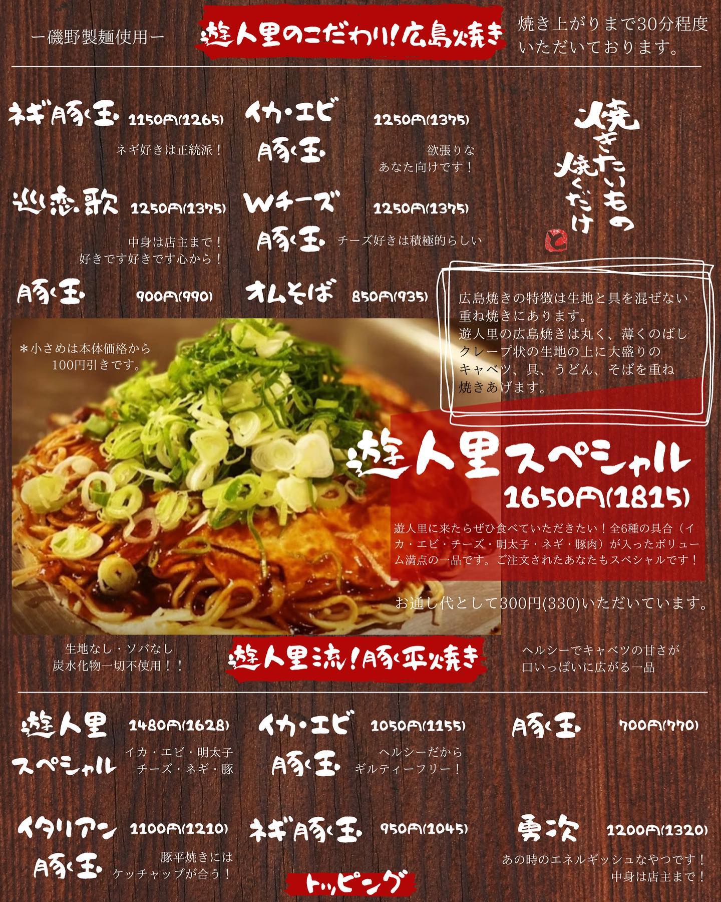 - "<京王線 千歳烏山駅 徒歩1分・ 芦花公園駅 徒歩11分の居酒屋>遊人里名物「広島焼き」「豚平焼き」をぜひお召し上がりください!全国各地から仕入れた自慢の食材を使用。その日ごとのオススメ食材を味わえるので、行く日によって違った組み合わせが楽しめる♪鉄板焼は高温の鉄板で一気に蒸しあげるため、食材が持つ旨味をギュッと閉じ込め、噛んだ瞬間に口の中でフワッと広がります♪野菜や魚介、お肉を使った串焼きも大人気!目の前で焼き上げられるお料理は圧巻!見た目から食欲をそそります。お席はカウンター・テーブル席をご用意。お一人様からご友人とのお食事会、ご予約いただければ貸切も可能ですので、お気軽にお電話でお問合せください!ネット予約も受付ております! Uber Eatsと出前館からデリバリーもご利用いただけます!"