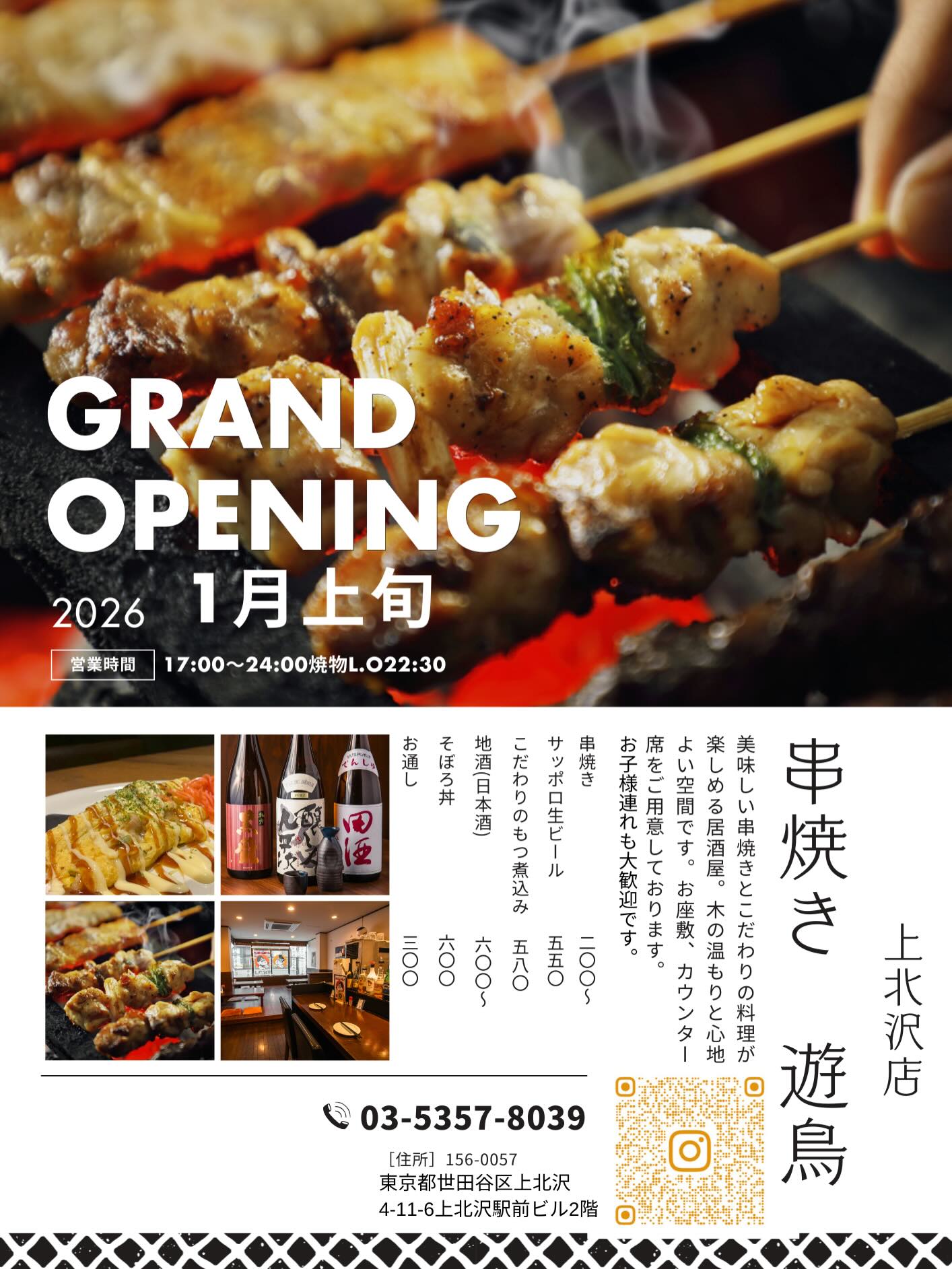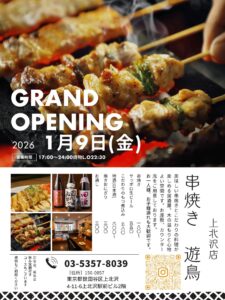 2026年1月9日リニューアル! 串焼き 遊鳥 yutori <京王線 上北沢駅 徒歩1分の焼鳥屋> 美味しい串焼きとこだわりの料理が楽しめる居酒屋。木の温もりと心地の良い空間です。お座敷、カウンター席をご用意しております。お子様連れも大歓迎です。 串焼き 遊鳥 yutori BLOG 1品メニュー手ごねつくねNew!!2026年1月6日Read more1品メニューグランドメニュー️New!!2026年1月6日Read moreプレスリリースオープン日決まりました️New!!2026年1月5日Read more Past Posts
