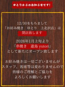2026年1月9日より新たに 「串焼き 遊鳥 yutori」としてリニューアルする事となりました️。
