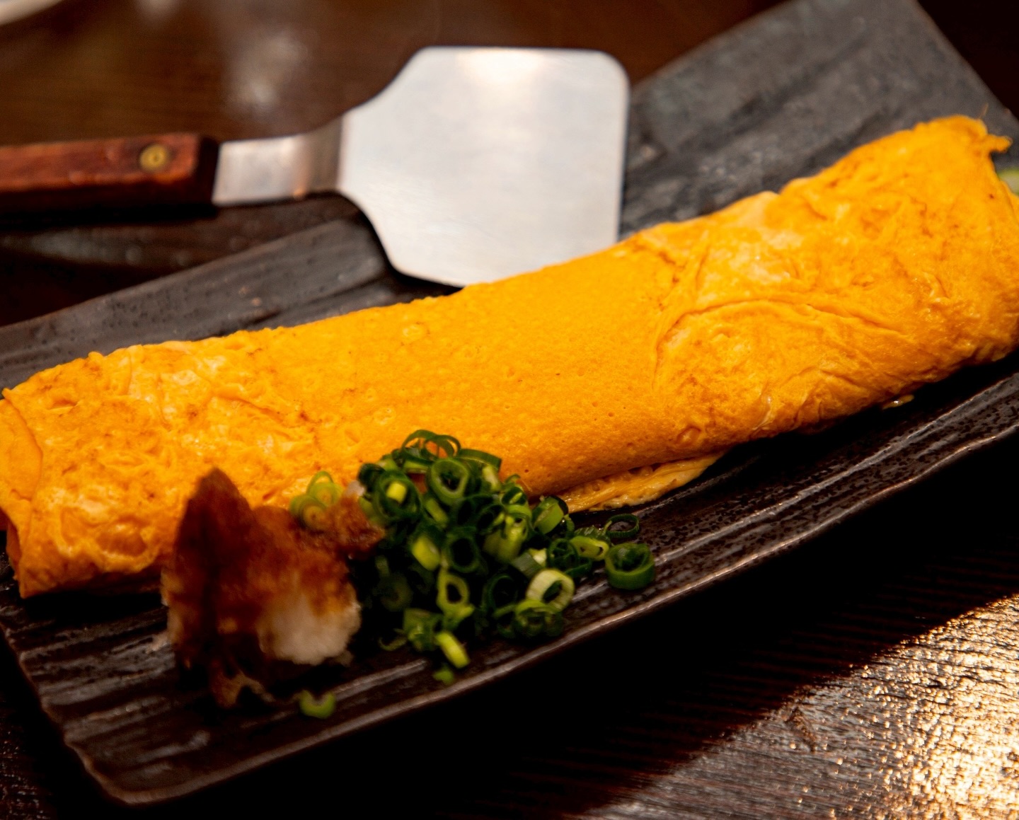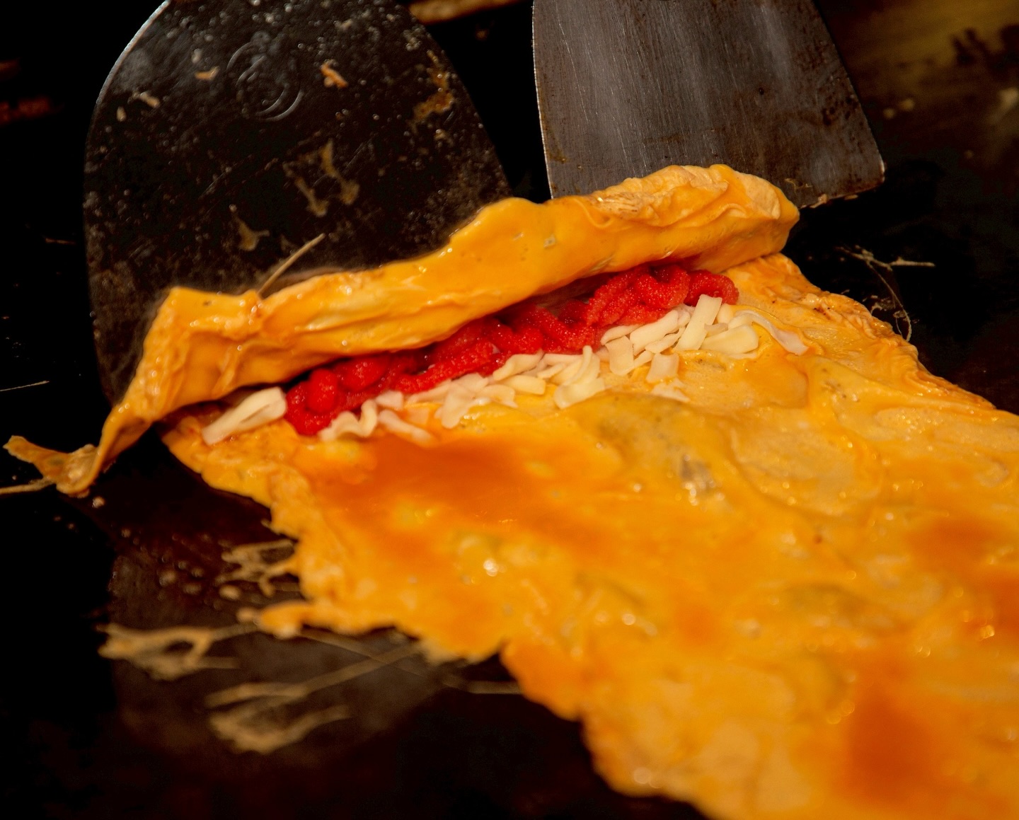 鉄板で焼いた卵焼き、明太子チーズ卵焼きも大人気です!カウンターに座って頂けたら目の前でライブ感も️